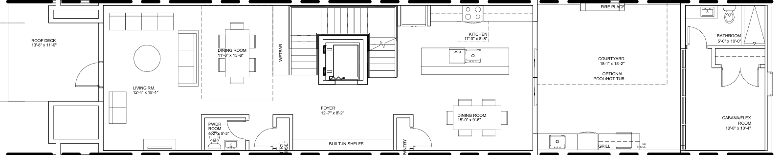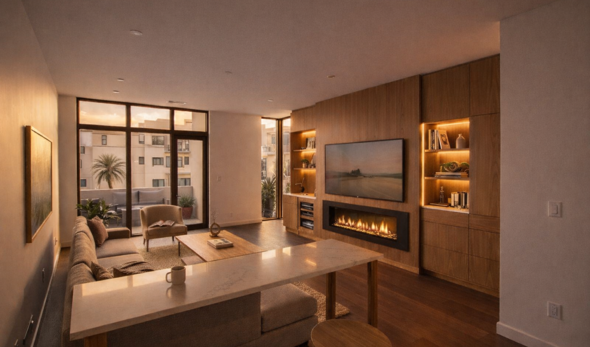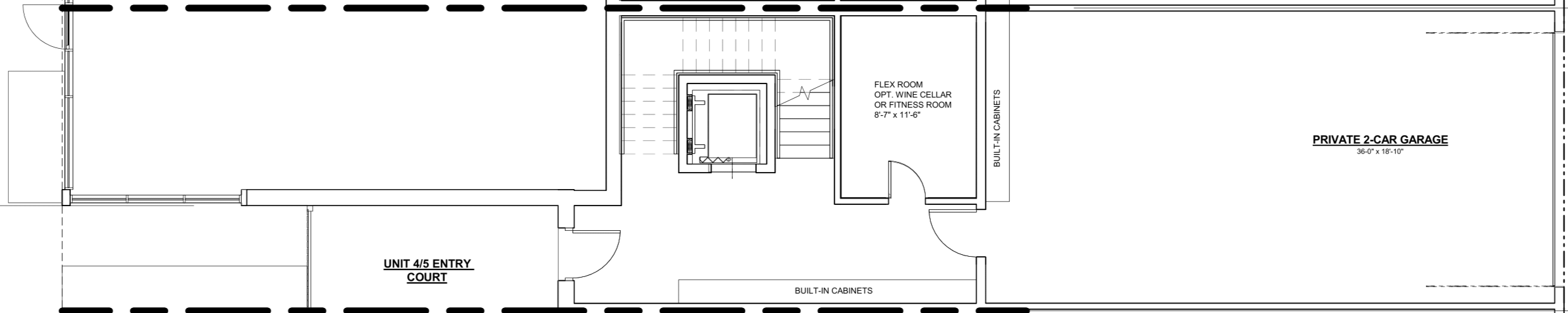 Private 4-car garage (36′ x 18’-10”), commercial space, and a dedicated flex room ideal for a wine cellar, gym, or studio. Private courtyard with grilling area and included linear gas fireplace, with optional pool or hot tub.