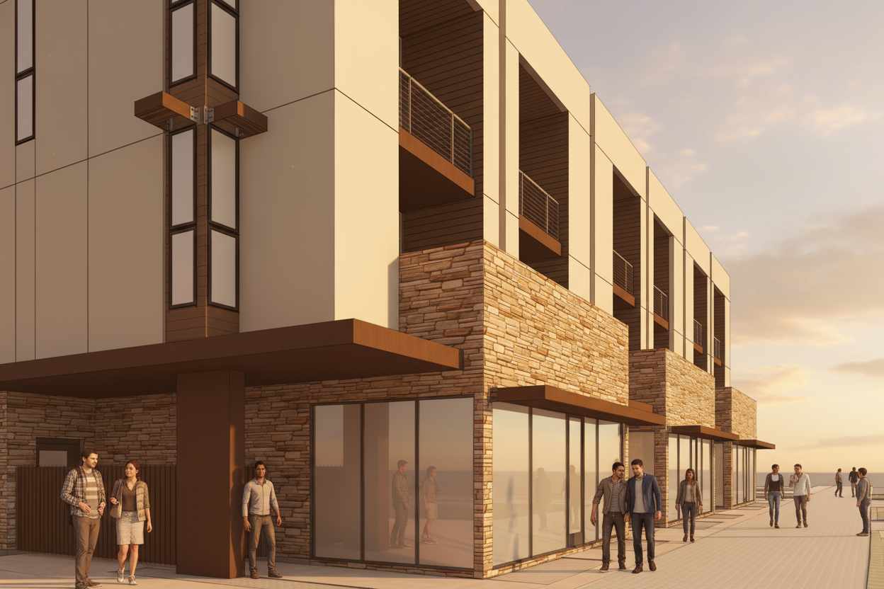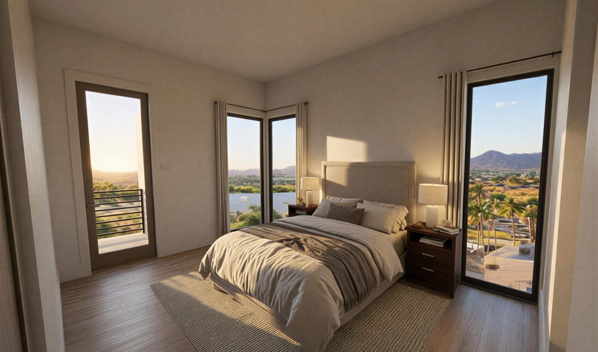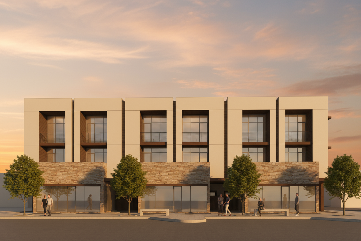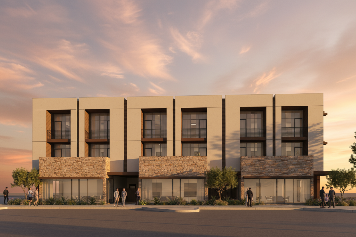 Luxury 4-story townhomes featuring 3 bedrooms, 3–4 full baths, additional half-bath(s), and a private elevator. Each unit includes a private courtyard, three balconies, an expansive 700 SF rooftop deck, and a private 4-car garage. The ground level offers garage access, a flex room, and a landscaped courtyard with a grilling area and fireplace. The second floor features an open kitchen, living, and dining layout with premium appliances and Italian marble finishes. The third floor includes the primary suite with en-suite bath, two guest bedrooms with full baths, and a laundry room. The fourth floor offers a private cabana and access to the rooftop deck with 360° mountain views and built-in entertaining amenities.