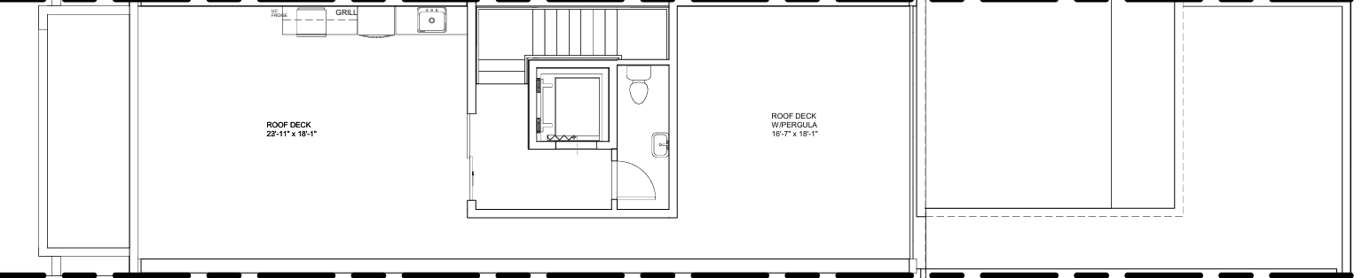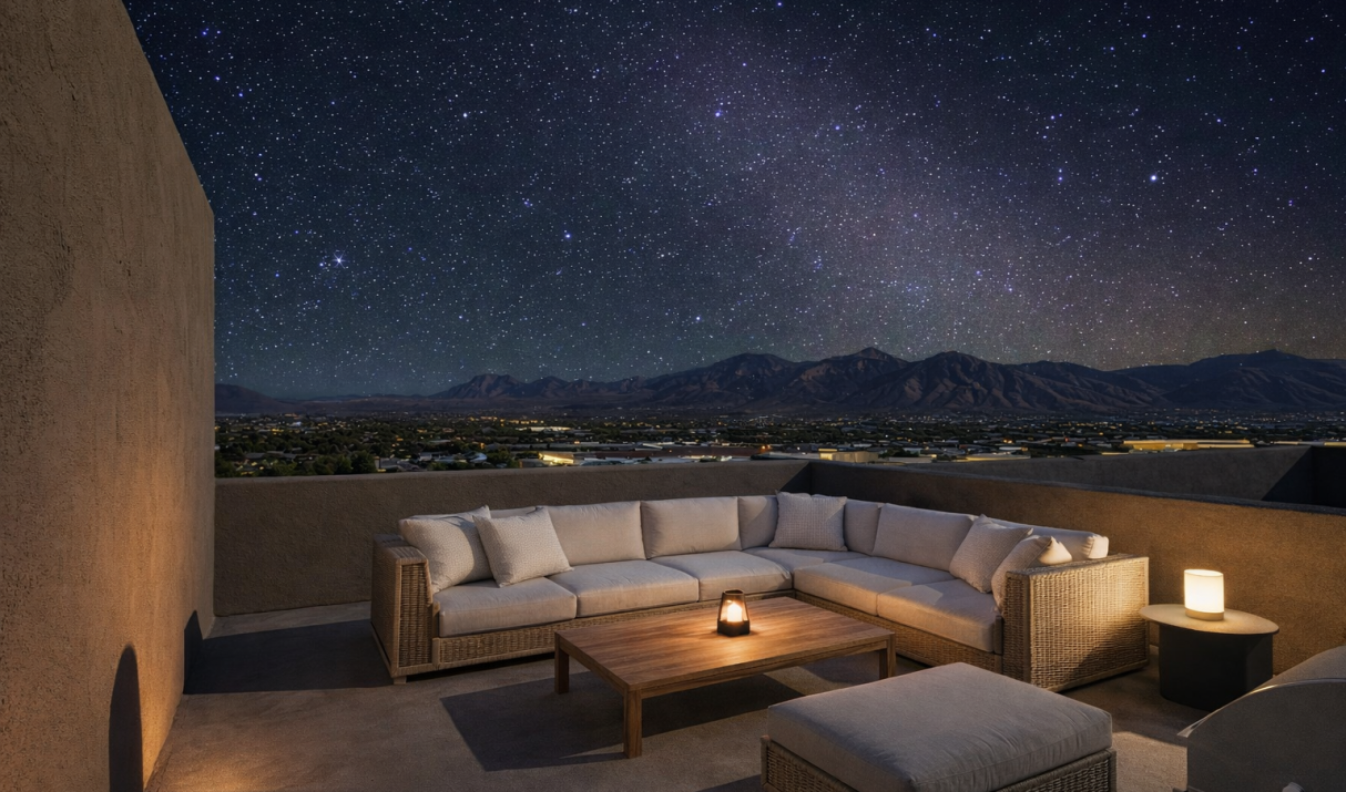 Expansive 700 SF rooftop deck with 360° mountain views, grilling station, under-counter refrigerator, and shaded pergola in select units. Cabana/flex room provides an additional entertaining lounge, studio, or office space.
