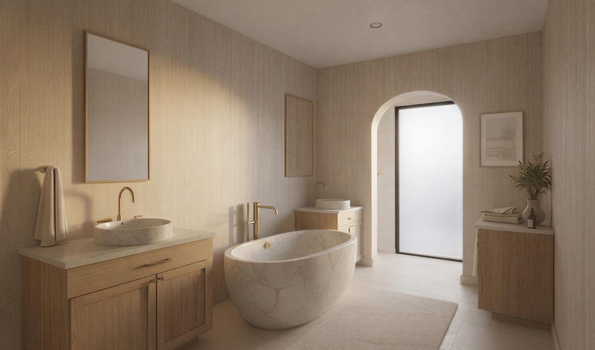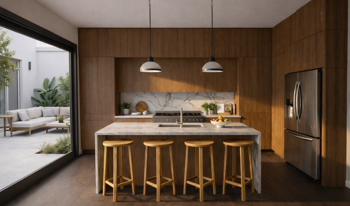 Modern open-concept kitchen, living, and dining areas featuring imported Italian marble countertops, custom cabinetry, and premium Sub-Zero, Wolf, or Bosch appliances. Additional half-bath(s) on select units. Sliding/stacking doors open to multiple balconies and the private courtyard below.